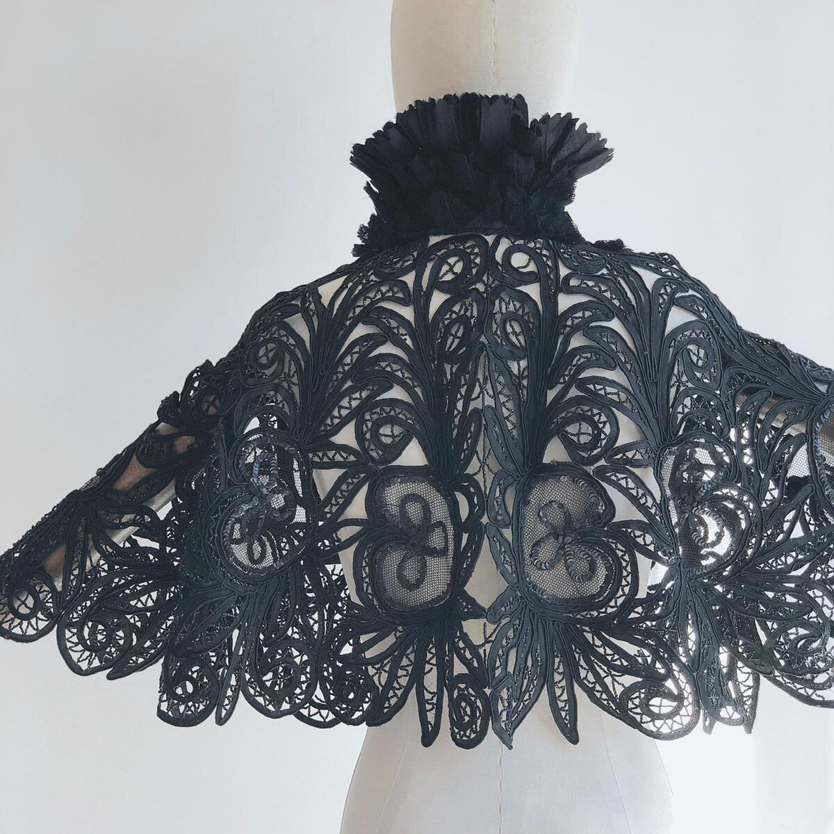 Gothic and ethereal, strange and beautiful: exquisite lace, dramatic silhouettes, unusual detailing and inventive tailoring from the 18th, 19th and early 20th centuries, handpicked and carefully restored. Gold and silver jewellery with romantic, esoteric and macabre symbolism from the same eras.