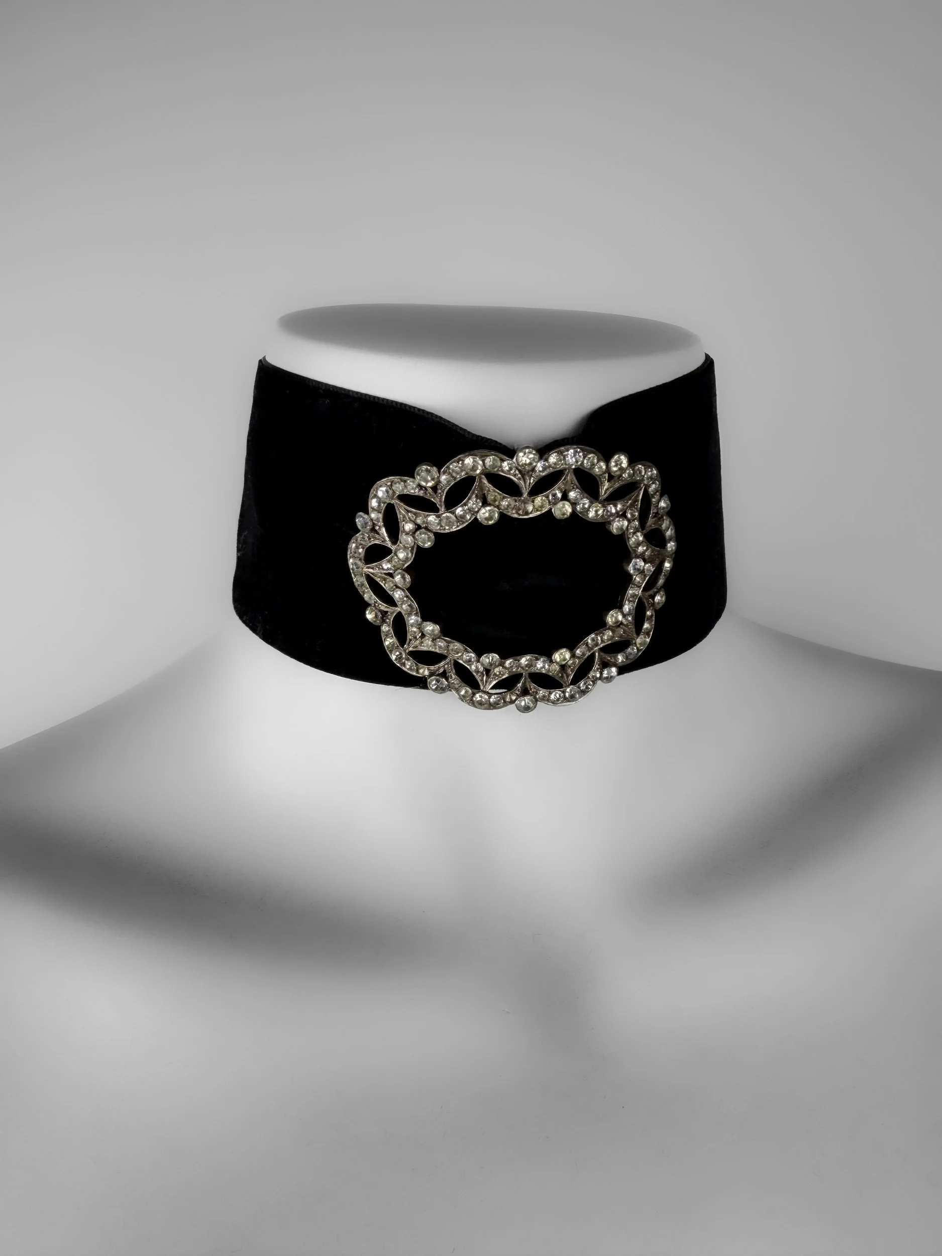 This choker features an original 19th-century paste buckle, repurposed into a wearable jewellery piece. Paste buckles of this type were originally used on shoes, sashes, or belts, with hand-cut glass stones made to resemble diamonds.