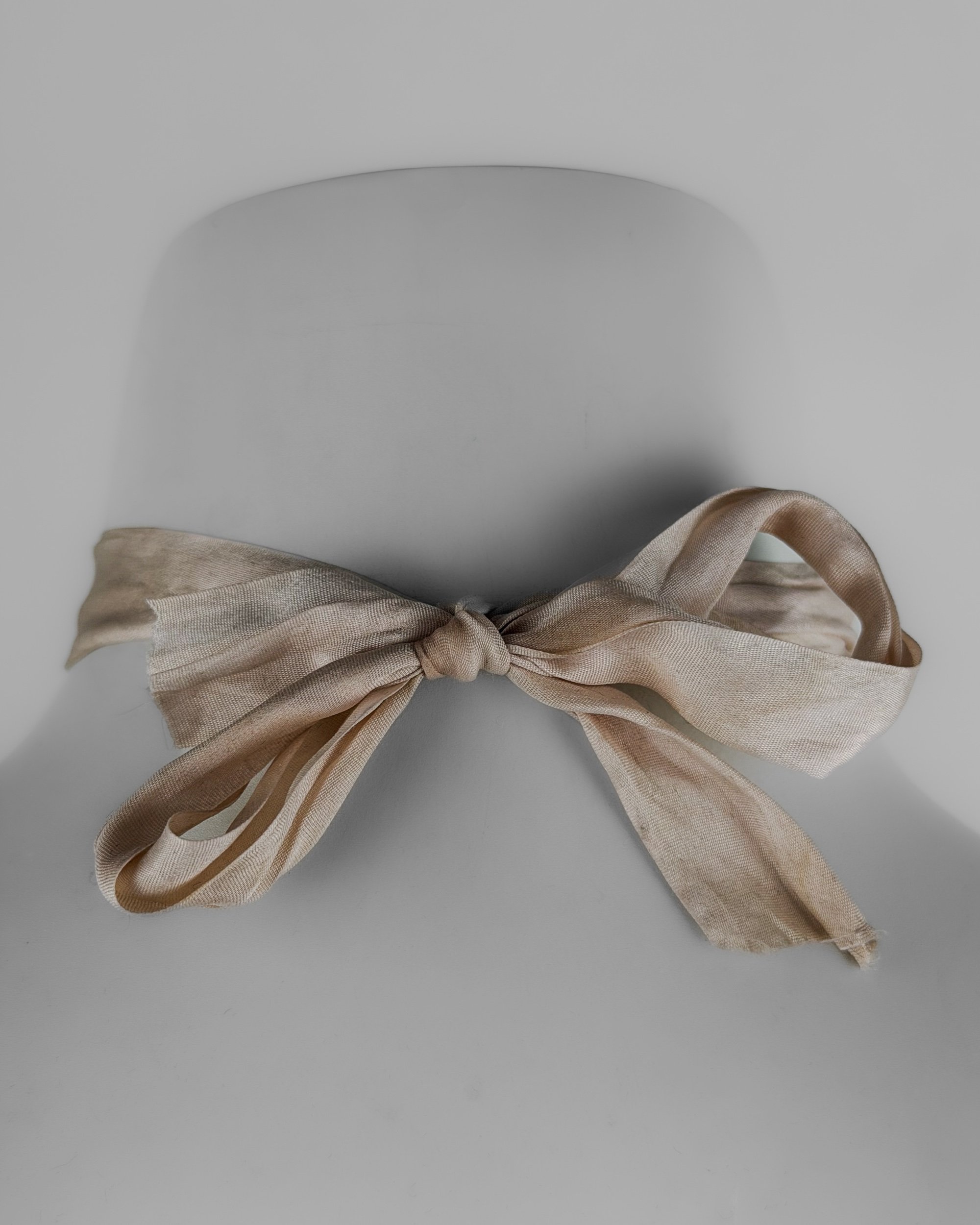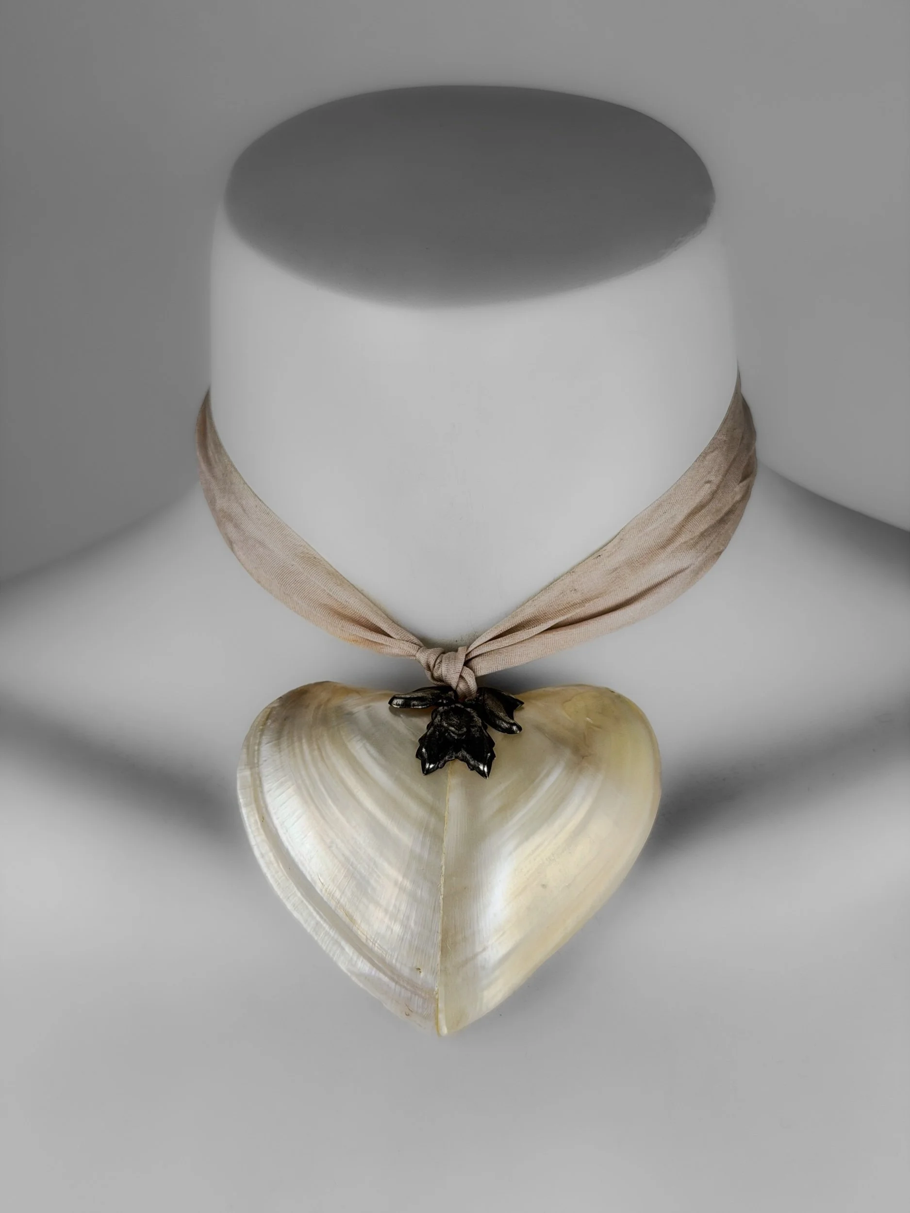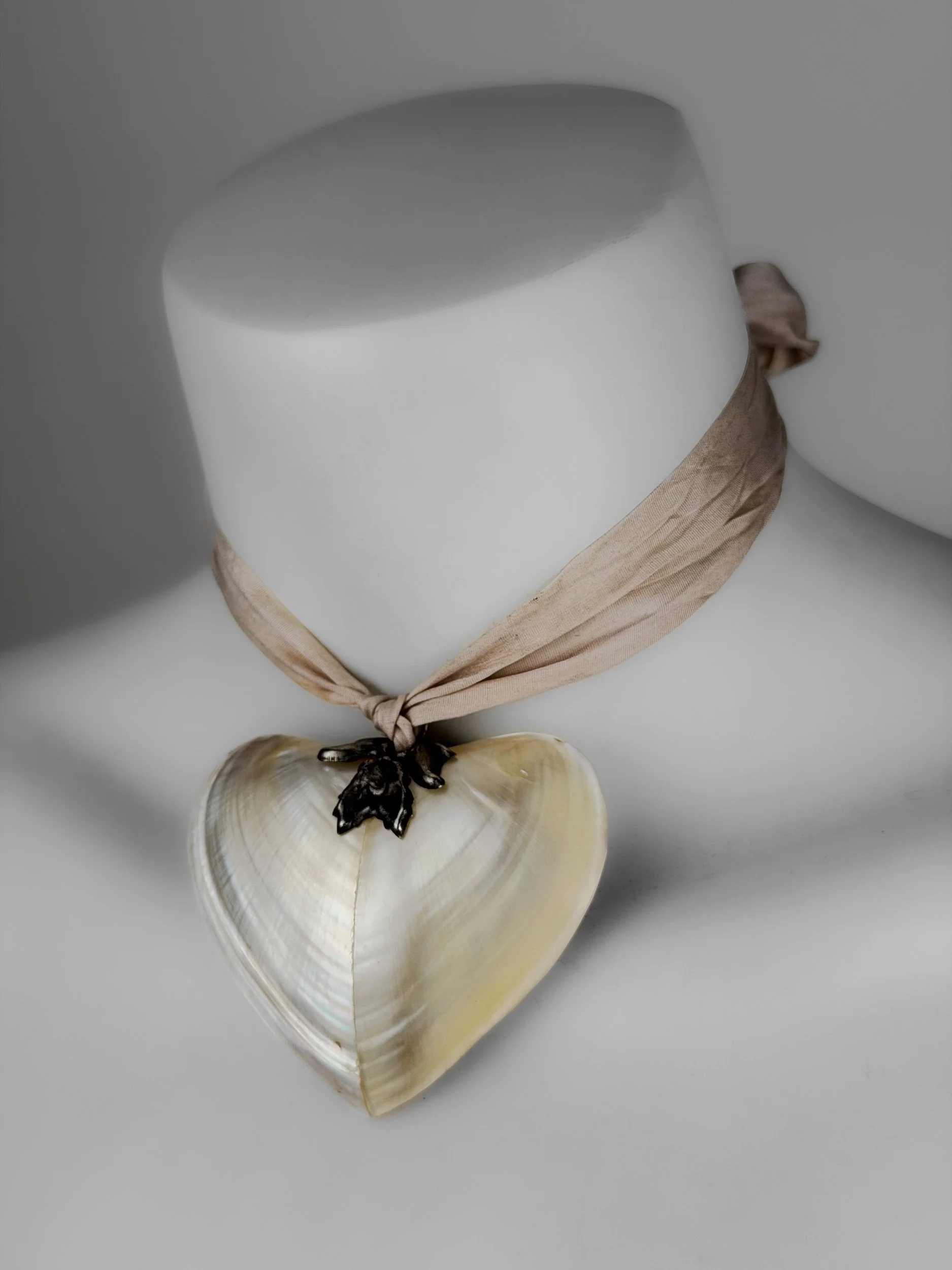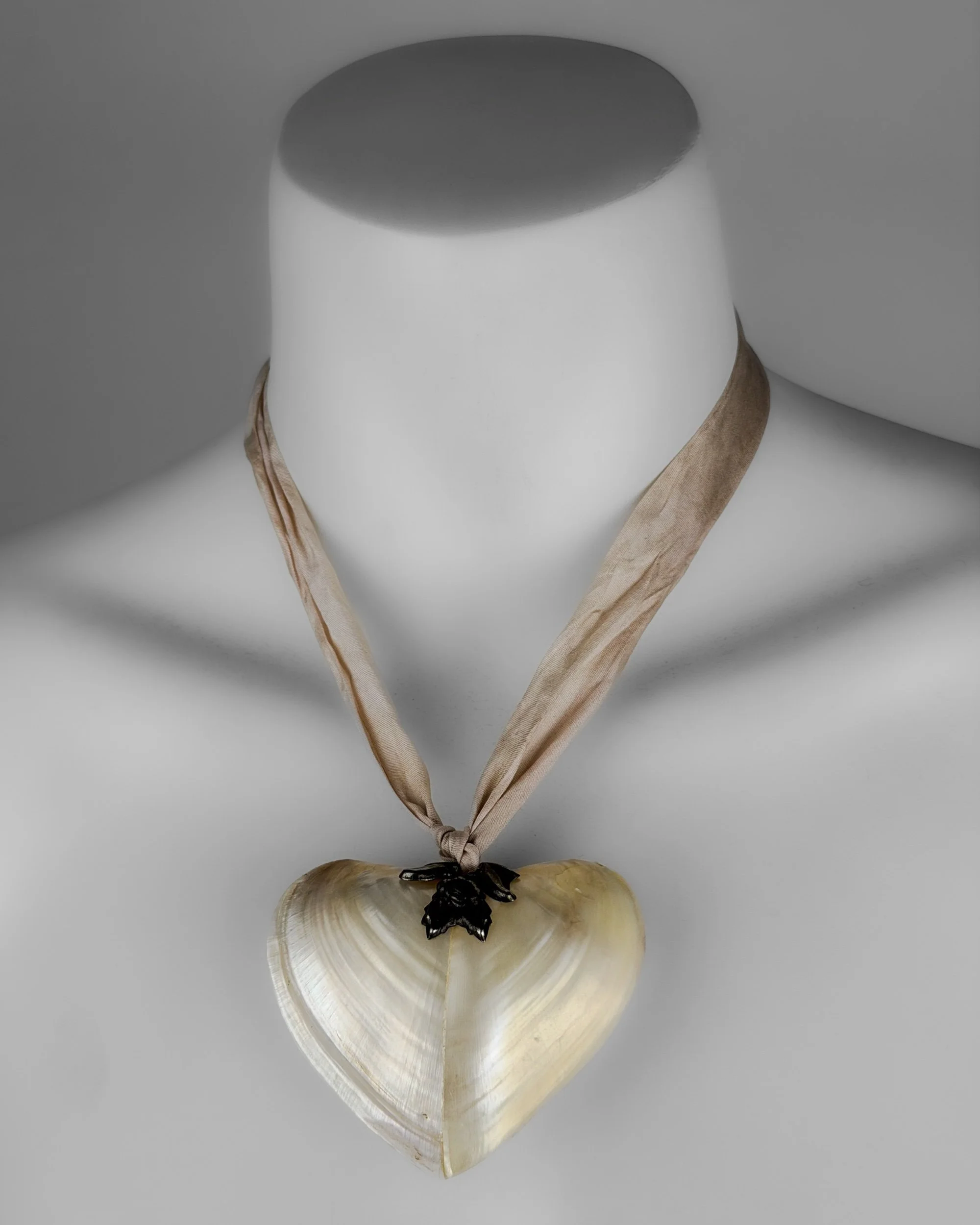 Vintage heart-shaped shell pendant with silver decorative bale hanging on hand-dyed, faded-rose silk ribbon.