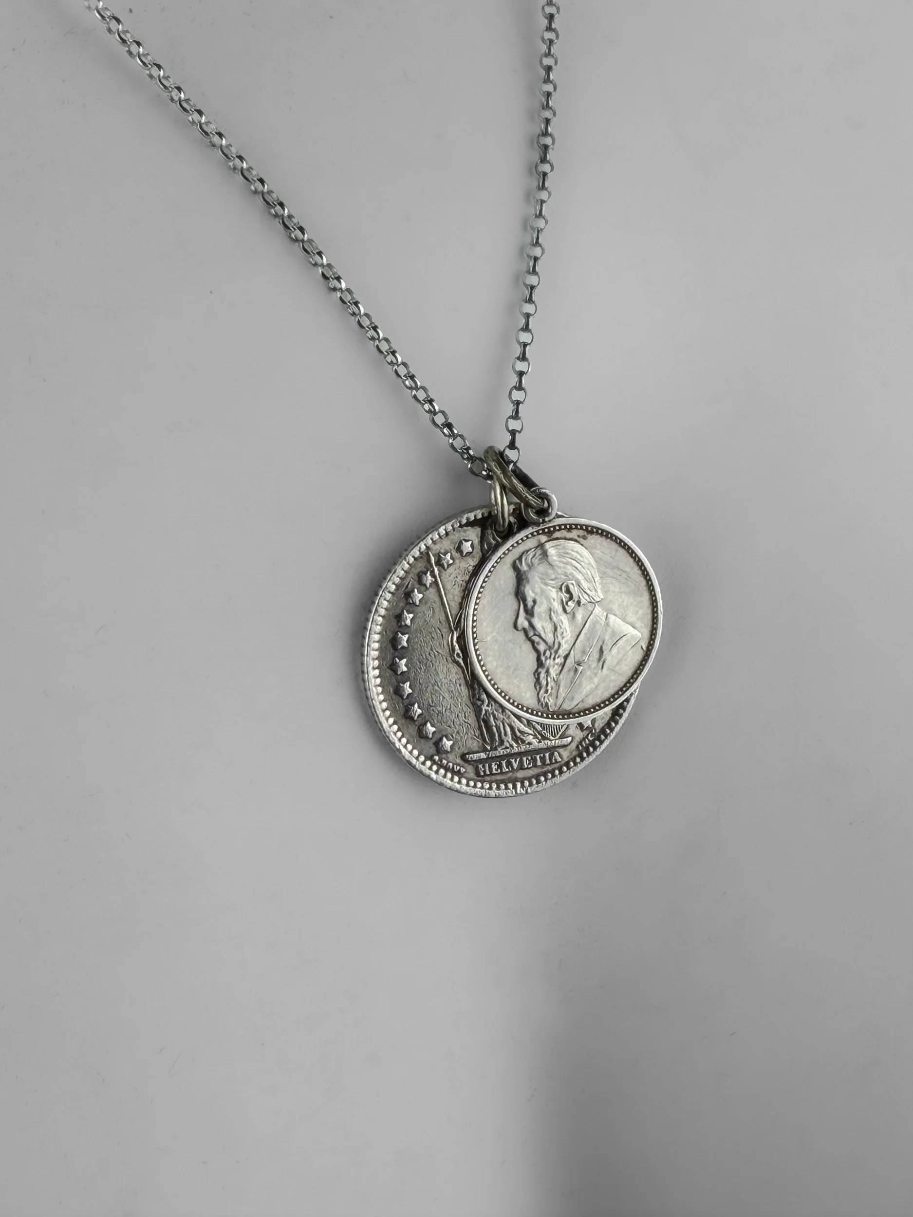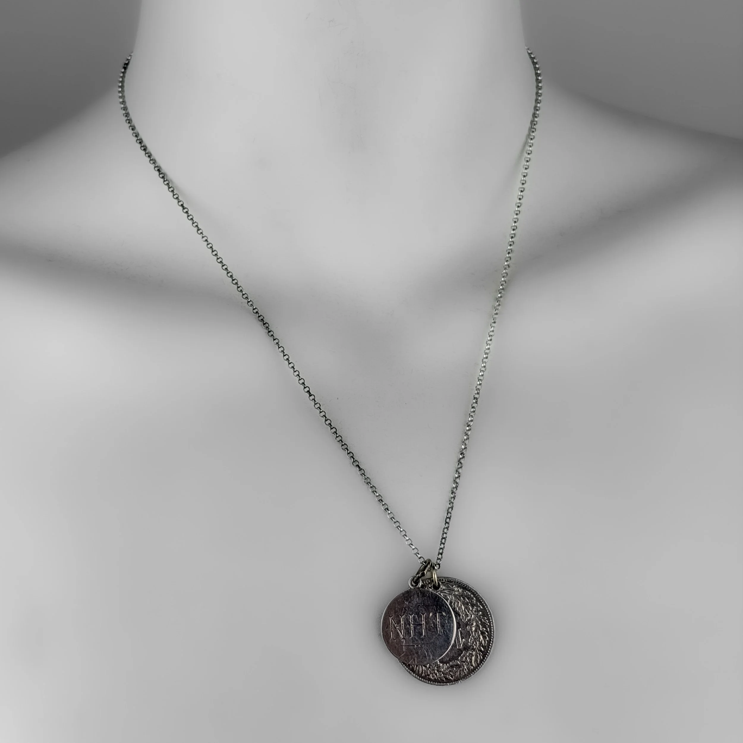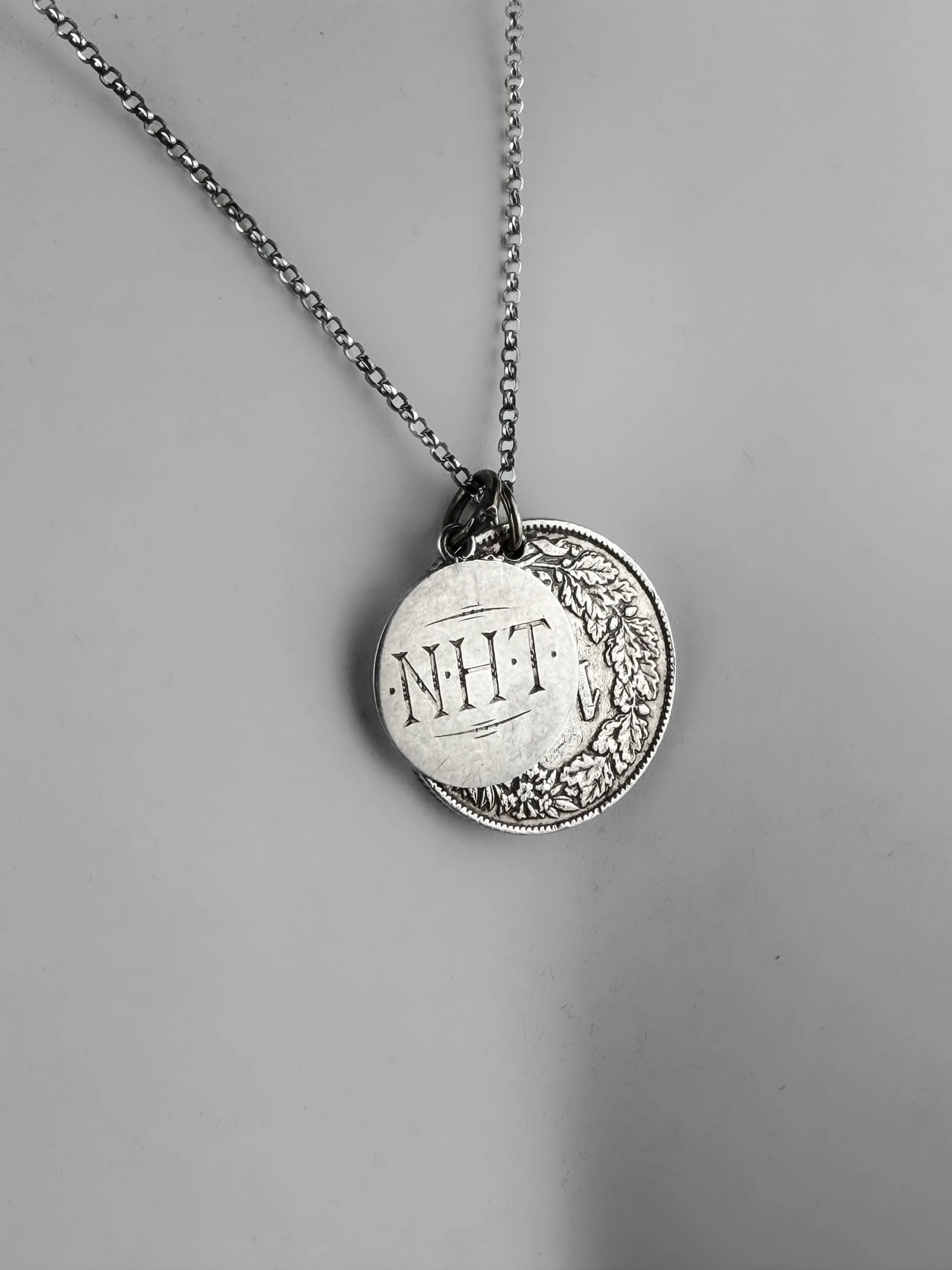 Here is an antique coin necklace with a Victorian sterling silver “Love Token” coin engraved with the initials ‘NHT’ and a 1914 1 Franc coin.