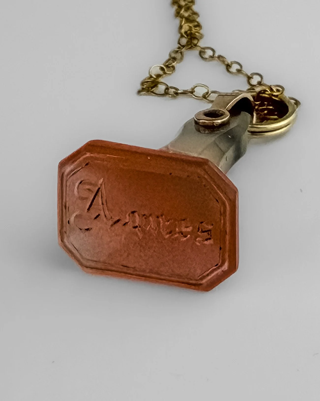 The stone is engraved with the name “Agnes” in intaglio, originally intended for use as a personal wax seal. The quartz has a soft, translucent blush tone with natural variation. When impressed, the seal produces a clear inscription of the name.
