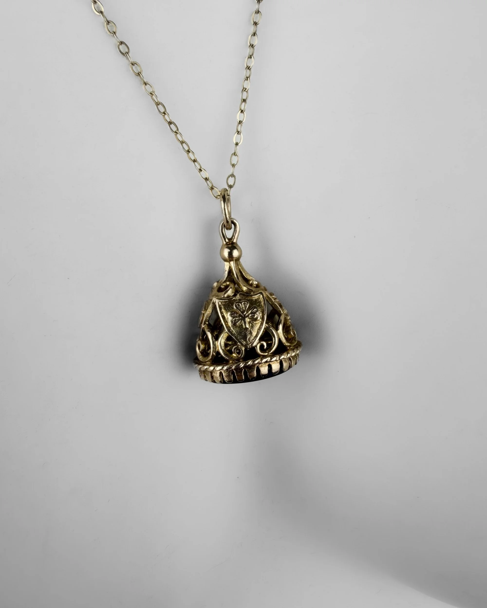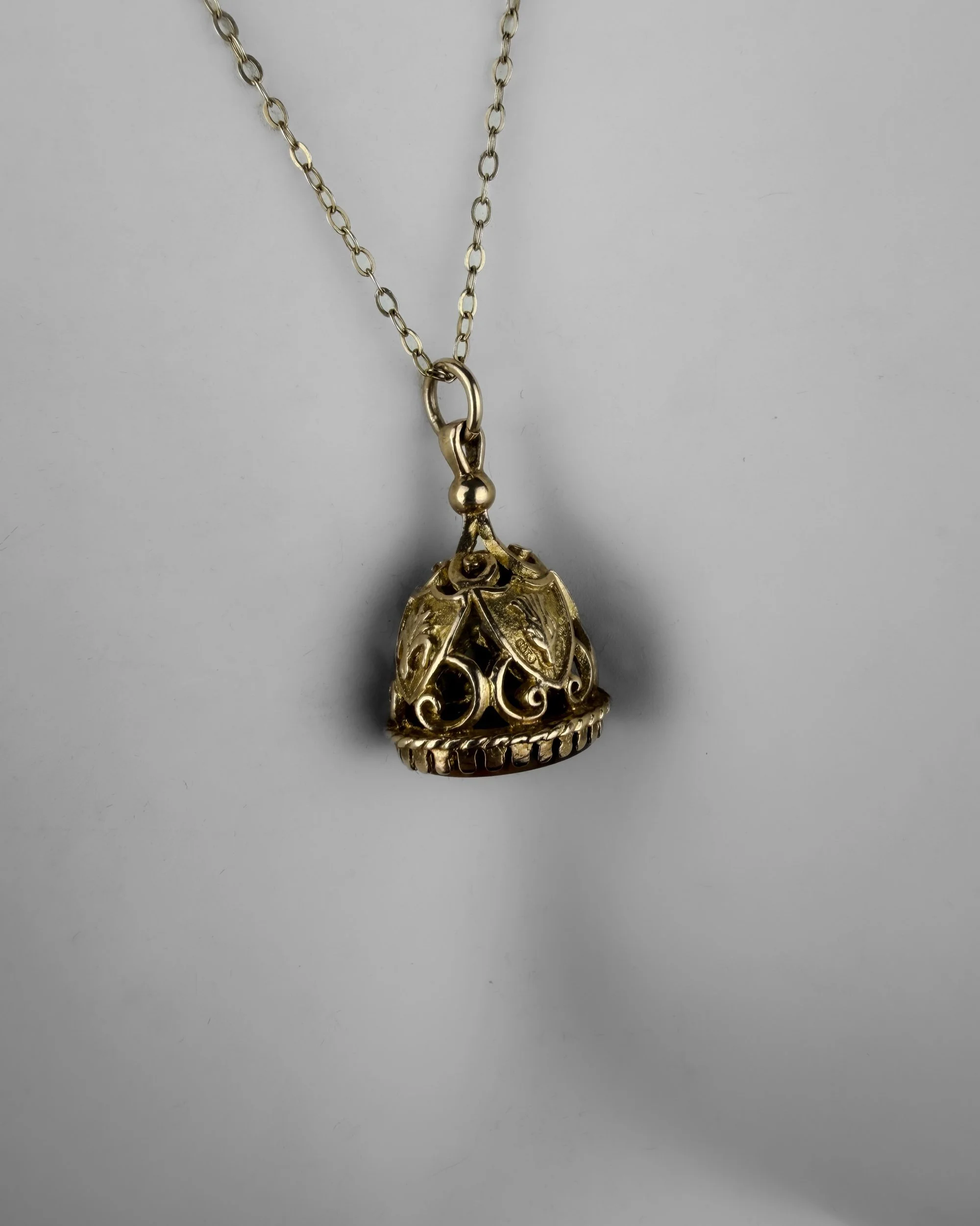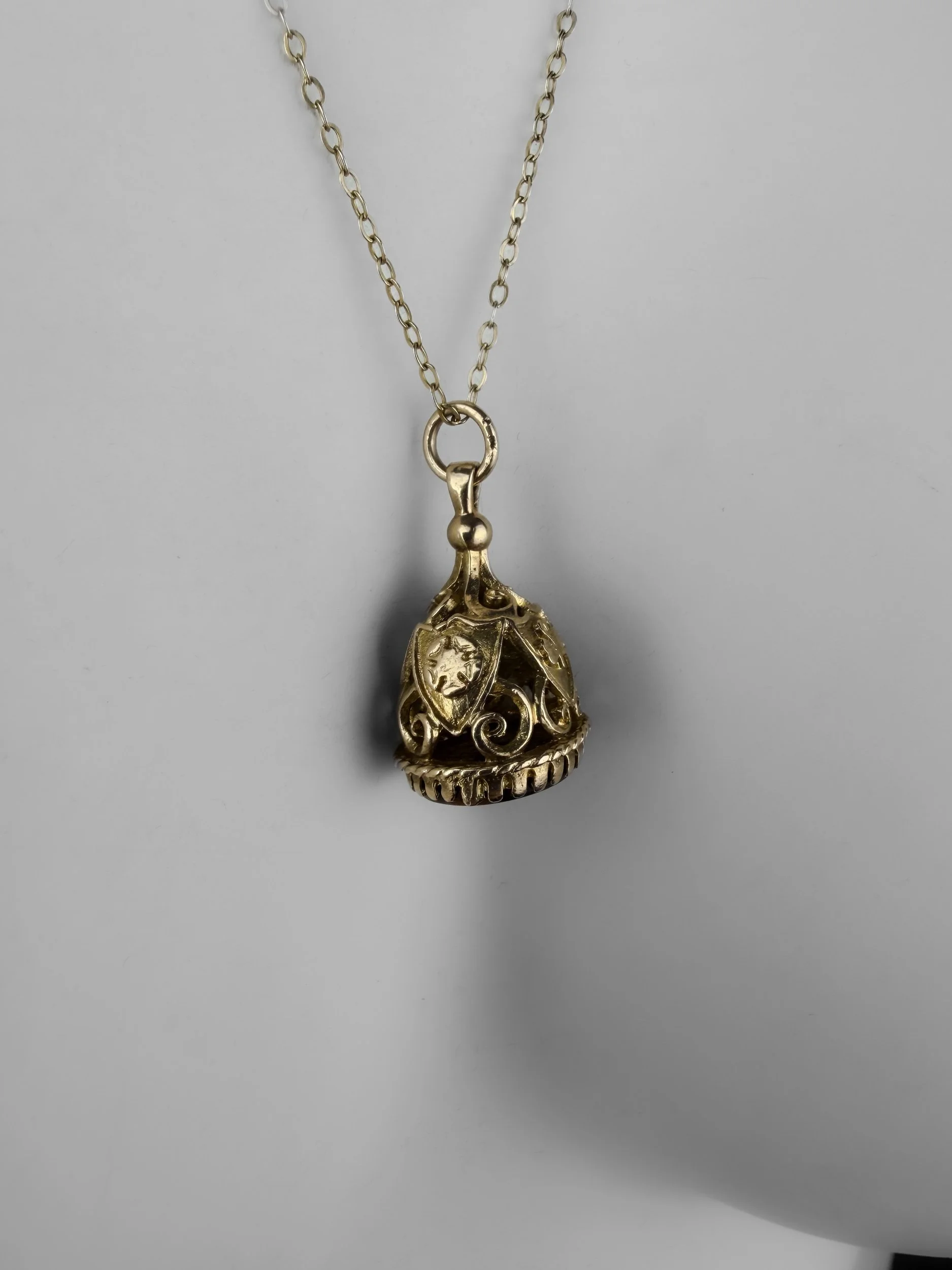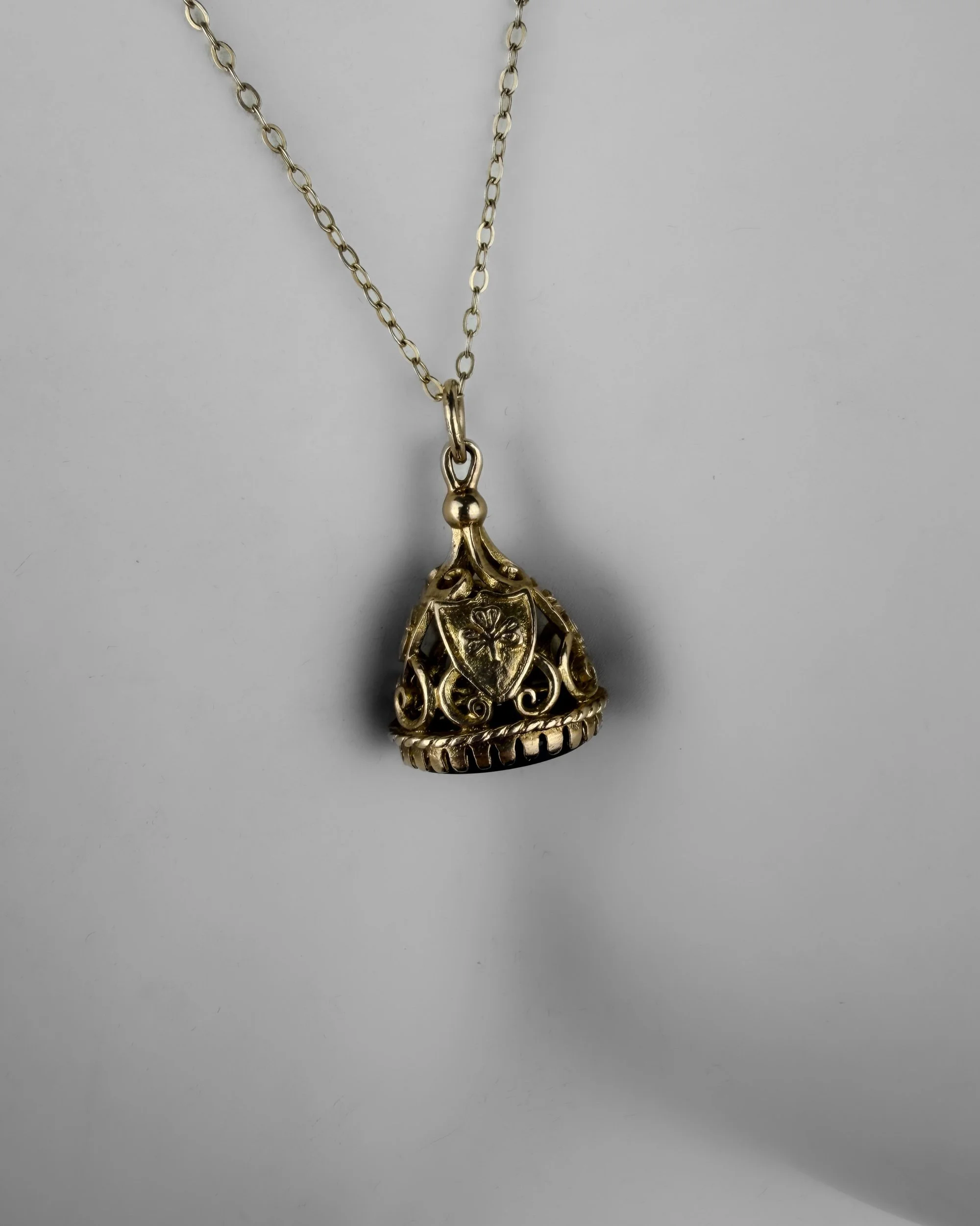 Tiger’s eye has long been associated with protection, strength and clarity. Its golden bands catch the light beautifully, a quality that made it especially popular in Victorian jewellery. The engraved shield motifs and openwork mount echo heraldic symbolism linked to honour and resilience.